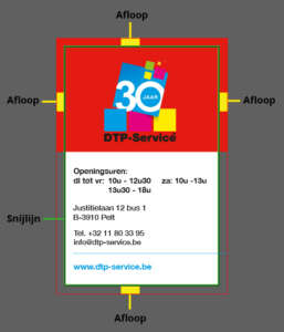 Helaas is dit ook het geval bij een snijmachine. Hoe goed de snijmachine ook is, er is altijd kans op een eventuele verschuiving, waardoor er witte randjes ontstaan. Dit wil je natuurlijk voorkomen. Maar hoe doe je dat, zonder dat je iets van het formaat verliest? Dit doe je door een paar millimeter aan om het ontwerp heen toe te voegen, waardoor het drukwerk probleemloos kan worden afgesneden. Dit is de afloop! Dit wordt ook wel eens snijmarge genoemd.